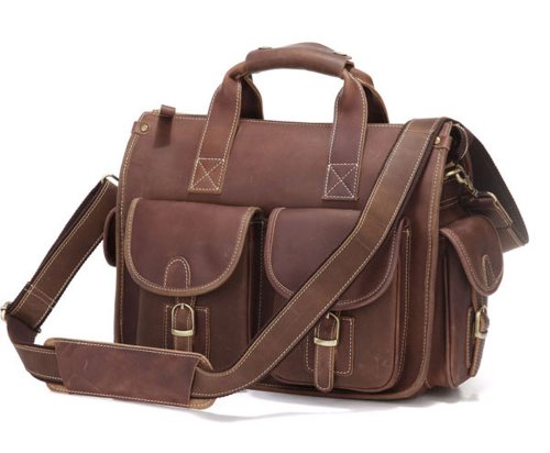 Product Description: .100% Guarantee genuine - excellent Crazy Horse Leather .Size approximately 13.5" L x 6" W x 11.5" H inches (34.5cm L x 15cm W x 29cm H) .Dark brown color .Weight: 1.74KG .Double handles approximately 2" inches (5cm) drop be able to used comfortably, including an extra adjustable long strap, this purse may do four uses: laptop bag, briefcase, handbag, messenger bag .Bronze tone hardware .Zipper top closure .Inside is nicely lined with durable fabric, has a zippered pocket, a 13" laptop space and two additional pockets (fits for wallet and mobile telephone)